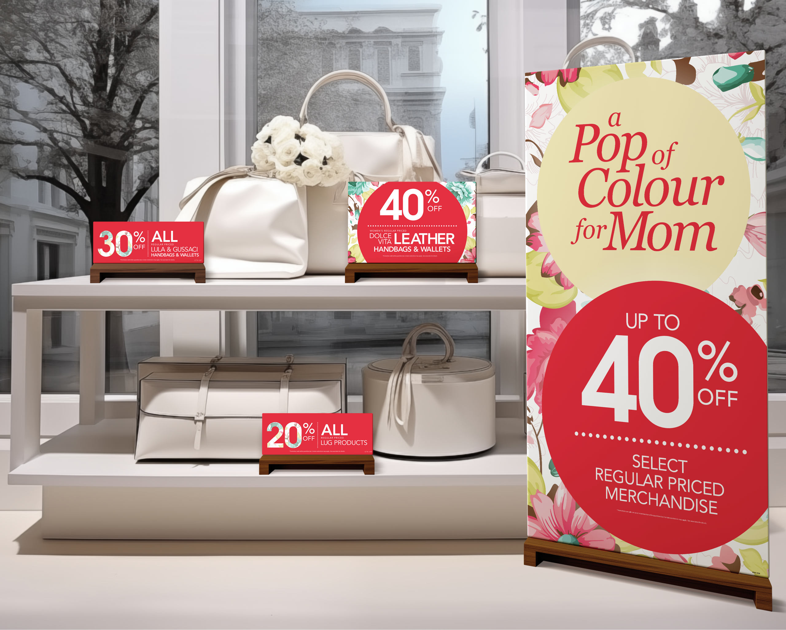 Mother's day signage package for the Access division of Bentley. The feature table showcased bright-colored handbags for mom and I wanted to mirror that in the signage that would be placed throughout the store.
