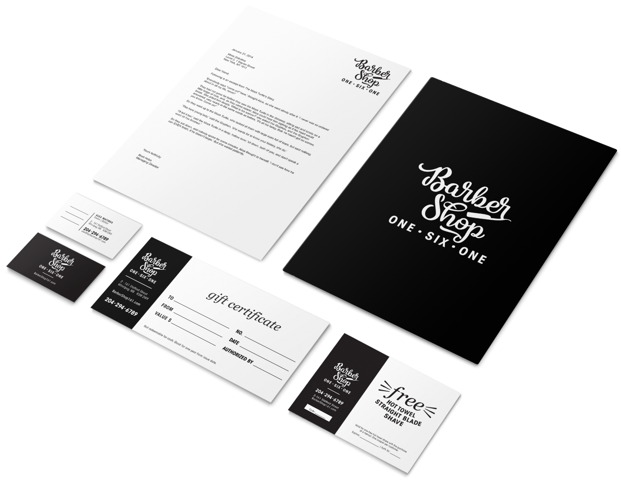 Barbershop 161 is a barbershop in Winnipeg, Manitoba that specializes in straight razor shaves. The owner Alexandra, who specializes in shaves herself, wanted the logo to reflect this. I went with a vintage script-style logo to reflect the style of her shop and a black and incorporated the straight razor into the design. Various stationary and gift certificates were designed along with the logo.