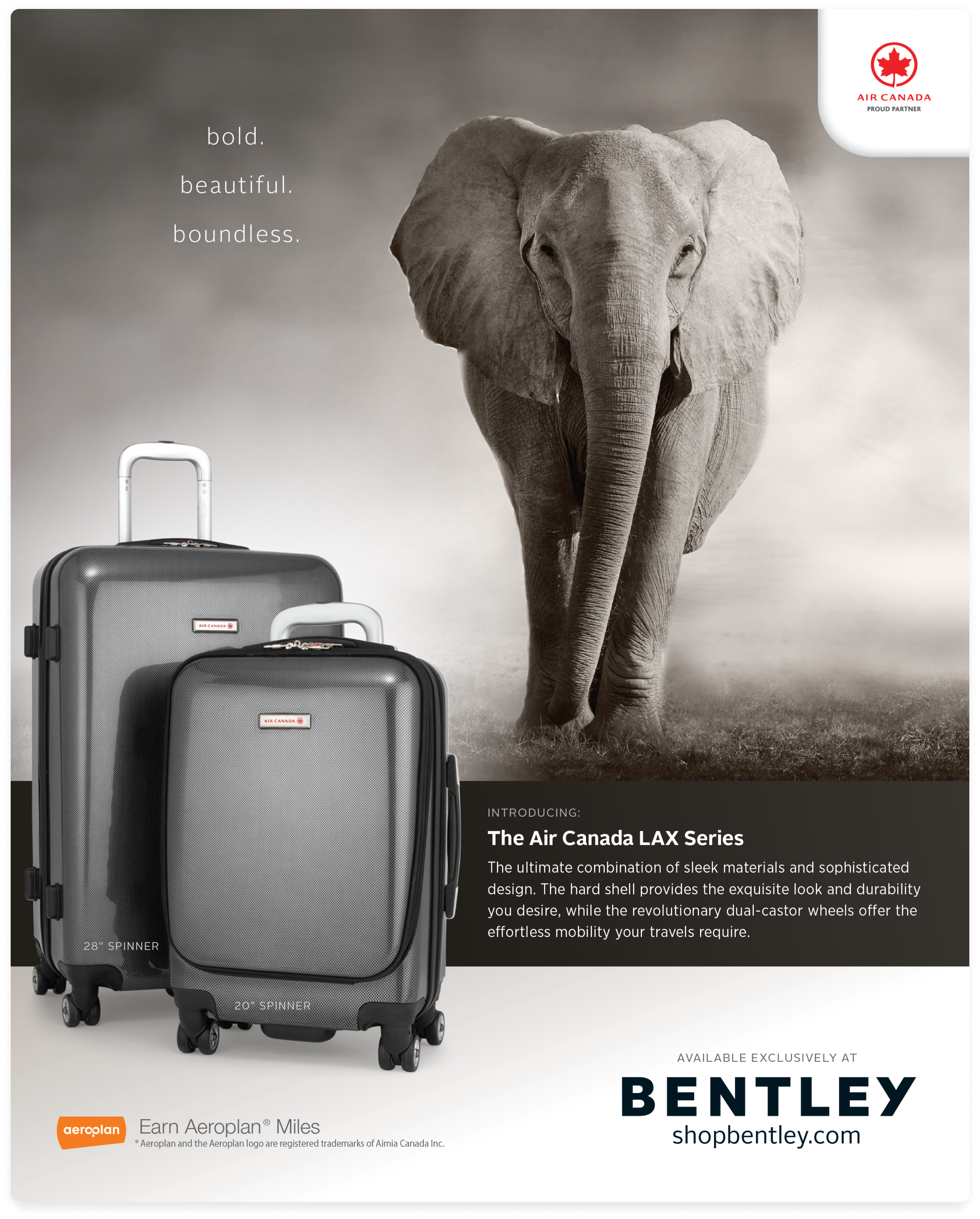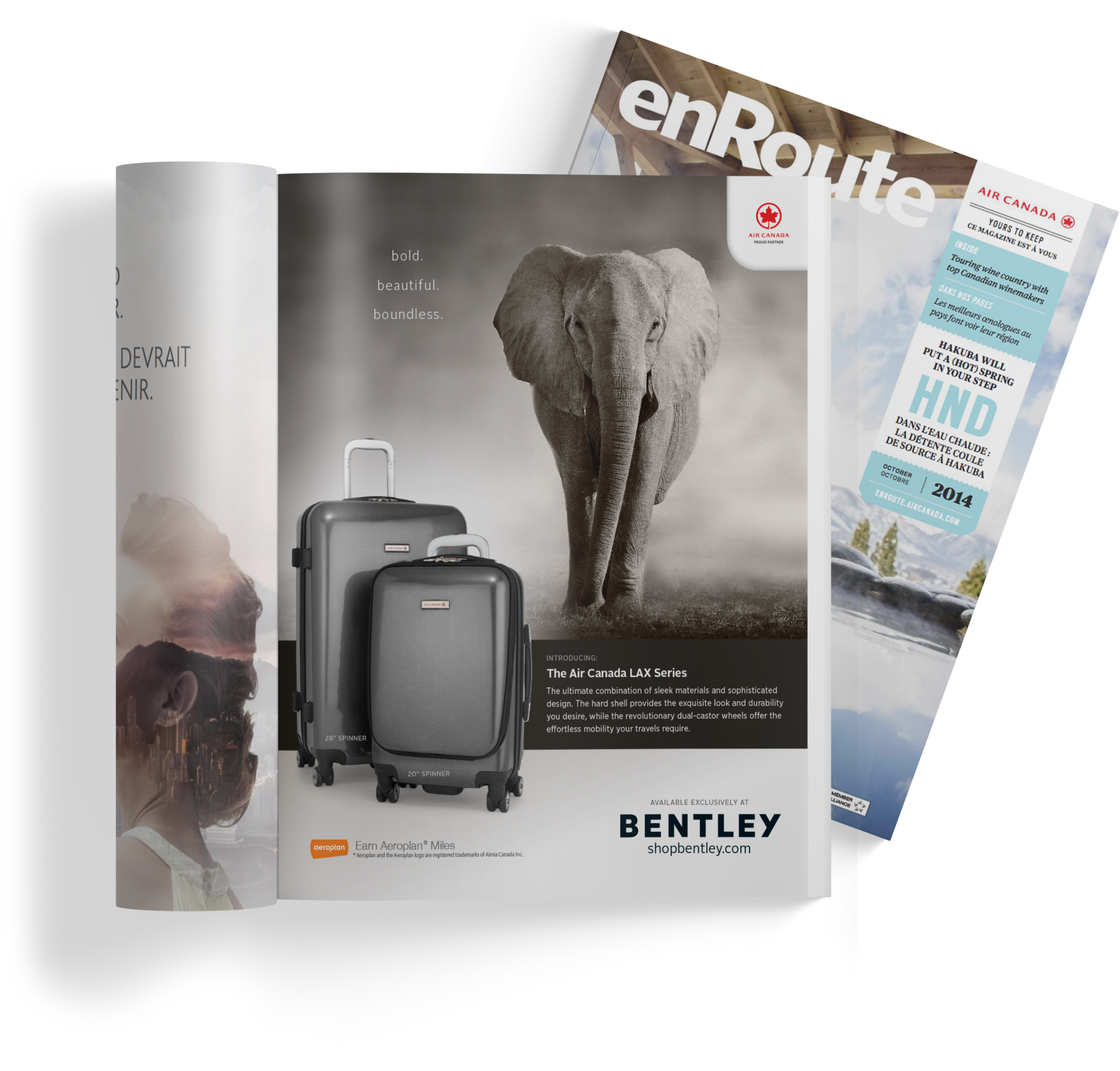 A print ad for Air Canada luggage that was published in EnRoute Magazine as part of a partnership between Air Canada and Bentley, who produces and sells the airline's various series of luggage. I provided photographic direction for the luggage, laid out the ad, and prepared the artwork for prepress according to the provided specs.