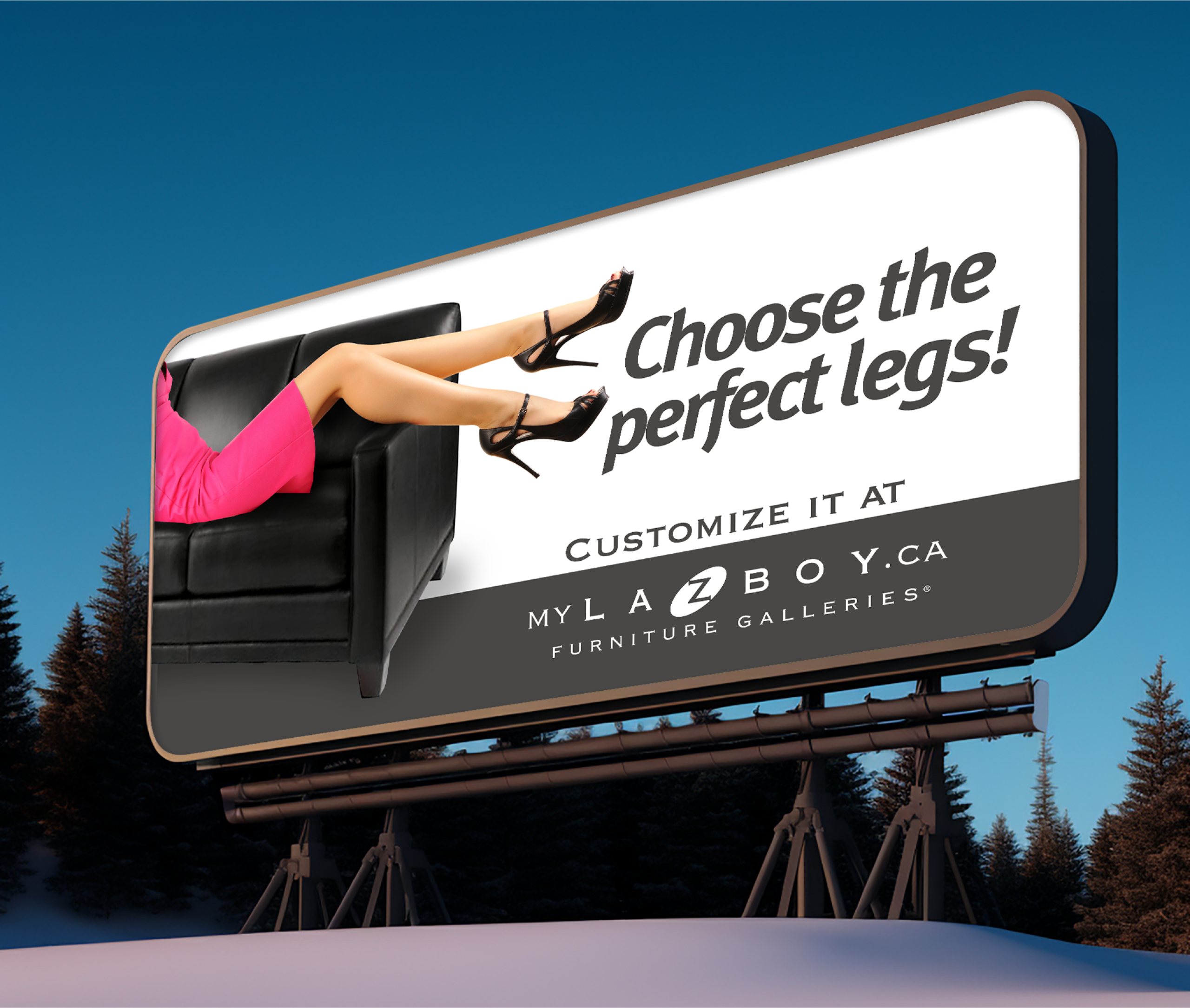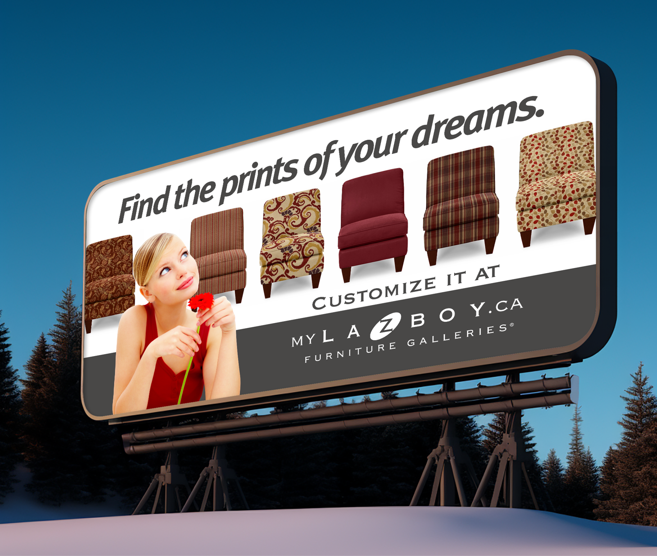 LazyBoy wanted to emphasize the many options for customizations with their products in the billboard campaign. I selected a series of chairs in prints that complemented the stock image I found to support the copy.