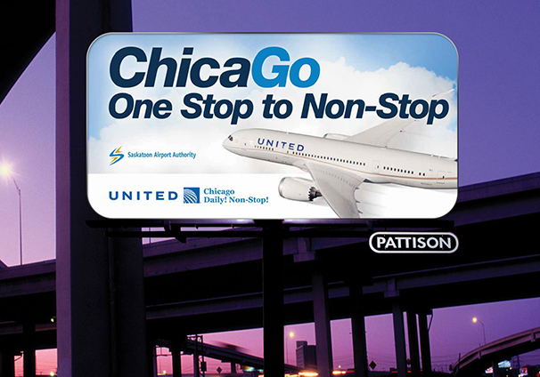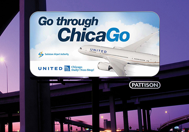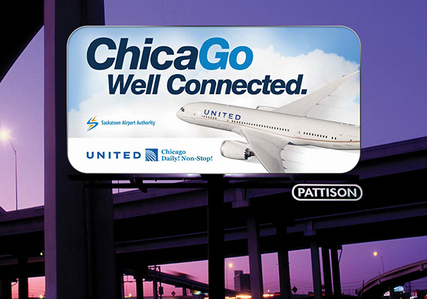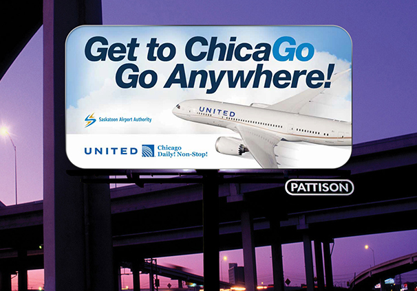 The Saskatoon Airport Authority was looking to promote flights to Chicago, an international hub. I changed the colour of the “go” in Chicago and capitalized the “g” to emphasize that you can go anywhere from Chicago. Various catchy tag lines further emphasized this concept.
