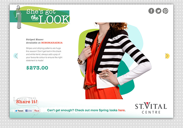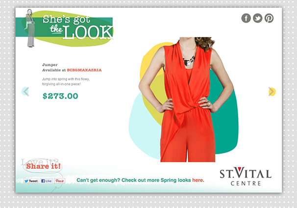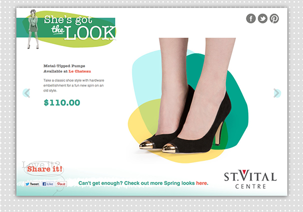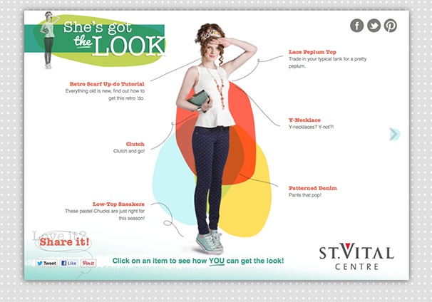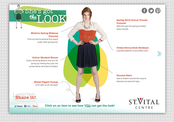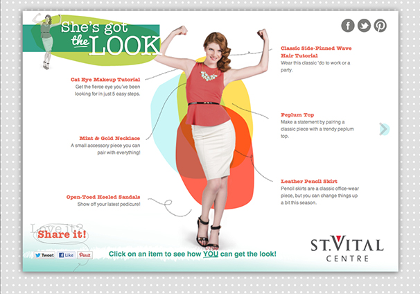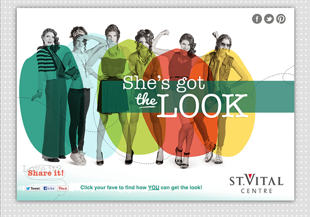 She’s Got The Look was St Vital Shopping Centre’s Spring 2013 campaign which consisted of online advertisements, social media, print inside the centre and a micro-site. The website invited viewers to click on one of six spring looks for more information on the items and video/photo tutorials to help them achieve the looks. www.stvitalcentrelook.com